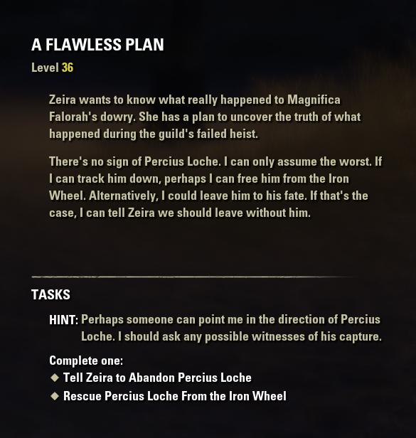 You can also ask Zeira but she will decline no matter what due to her own part of the plan. Read the book saw the clues Ive nothing on how this is solved. A Flawless Plan is a quest in Elder Scrolls Online.