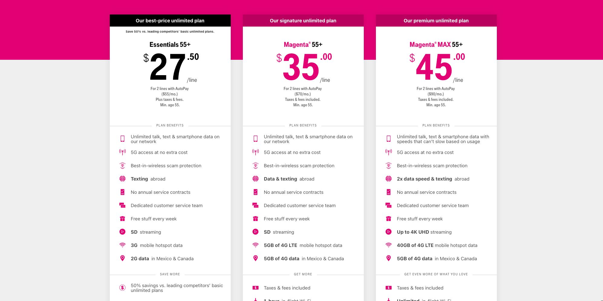 The T-Mobile Magenta plan has unlimited data and unlimited mobile hotspot making it a great plan for big data users. The plans run on T-Mobiles vast network which includes. As with all of T-Mobiles 55 plans youll also get unlimited talk text and data with the Essentials 55 plan so you can chat with your friends and grandkids all day long.